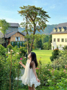 Khi ánh nắng chiều buông xuống, khung cảnh nơi đây như được phủ một lớp mật ong dịu ngọt. Căn nhà gỗ mộc mạc hiện ra bên lối nhỏ lát gạch uốn lượn, ẩn mình dưới tán cây xanh biếc Gió thoảng qua khe lá, đưa theo mùi cỏ mới cắt, thoảng cả mùi khói ...