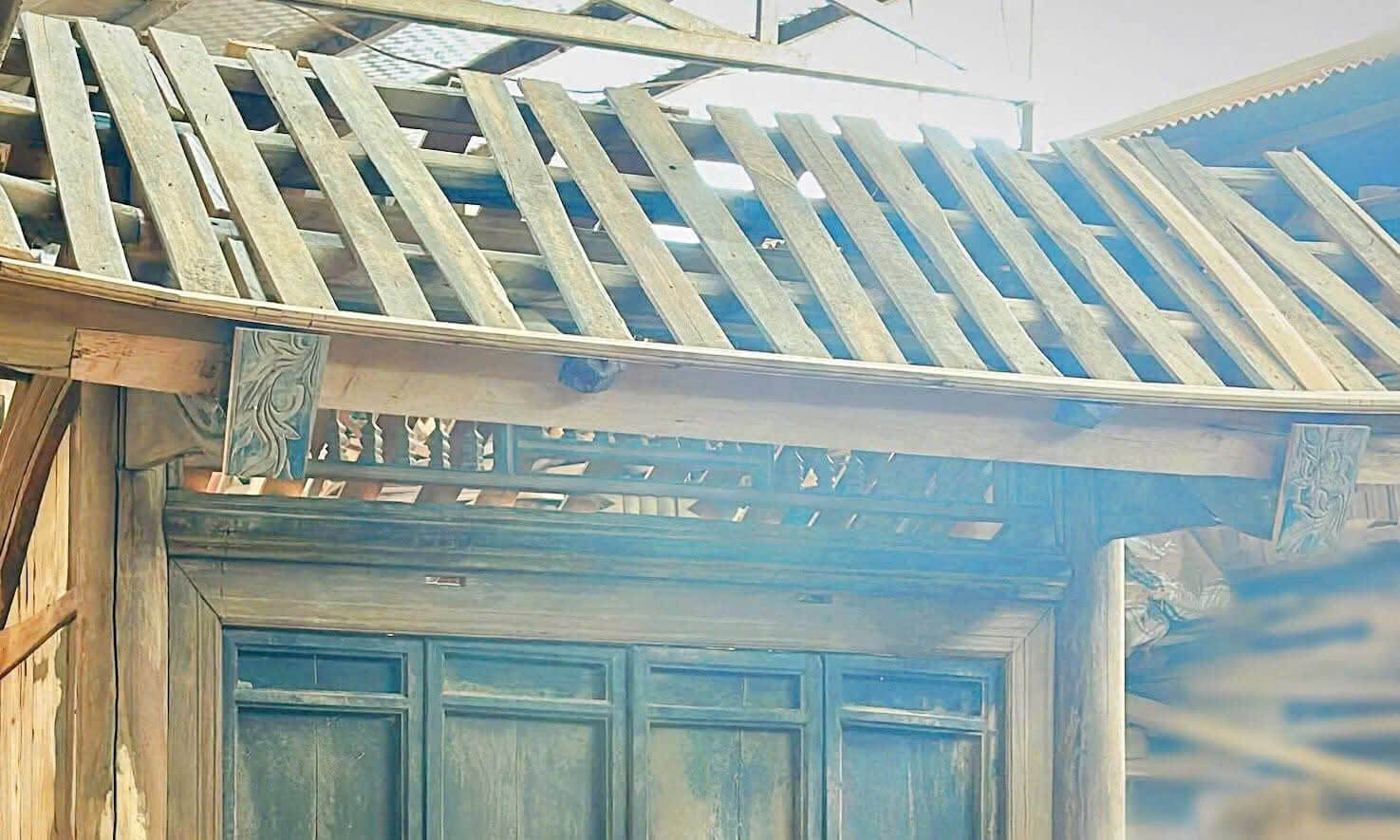 Chiếc cổng gỗ cổ trong bức ảnh mang dáng dấp đậm chất kiến trúc truyền thống Bắc Bộ. Từng cột gỗ tròn vững chãi, mái ngói dốc thoải cùng hệ khung gỗ chắc nịch tạo nên một nét đẹp mộc mạc nhưng đầy uy nghi. Đây không chỉ đơn thuần là một chiếc cổng, mà còn là điểm nhấn khởi đầu cho không gian, gợi nhớ đến những ngôi làng xưa, nơi mỗi nếp nhà, mỗi cổng làng đều thấm đượm hồn quê.
