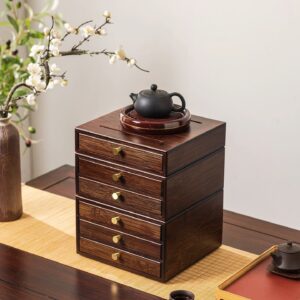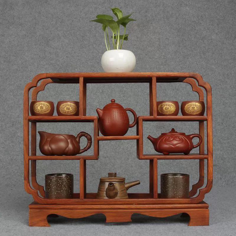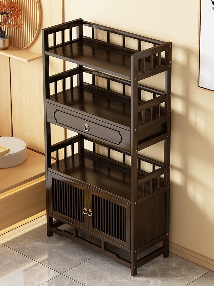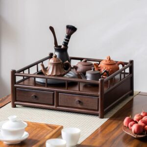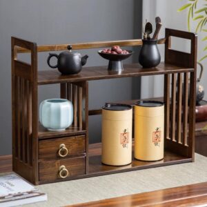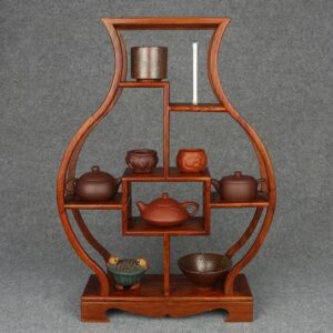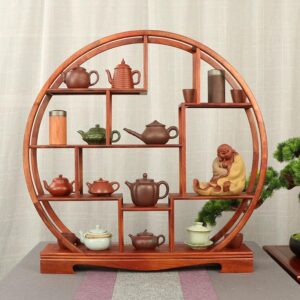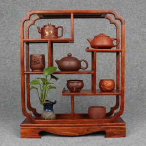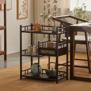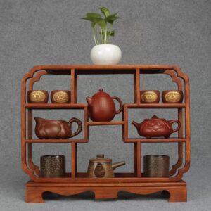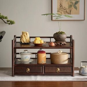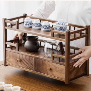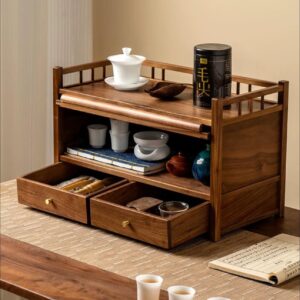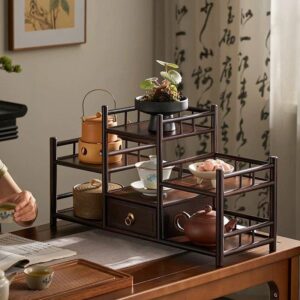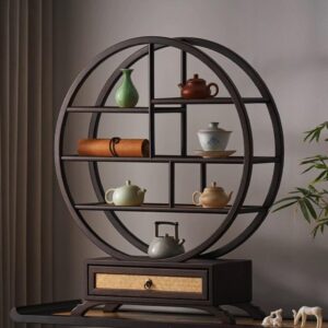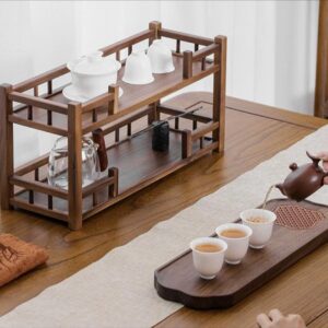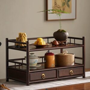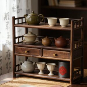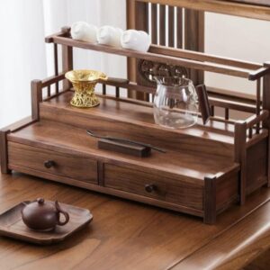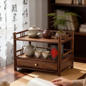 Thiết kế của kệ chú trọng tính công năng nhưng không đánh mất tính thẩm mỹ. Các tầng kệ được phân chia hợp lý để đặt ấm trà, chén, hũ trà và phụ kiện. Ngăn kéo nhỏ phía dưới giúp cất gọn những vật dụng như muỗng, khăn trà hay dụng cụ pha trà, giữ cho không gian luôn gọn gàng. Một số mẫu còn sử dụng bố cục đối xứng hoặc hình tròn – gợi liên tưởng đến sự viên mãn và hài hòa trong văn hóa phương Đông.