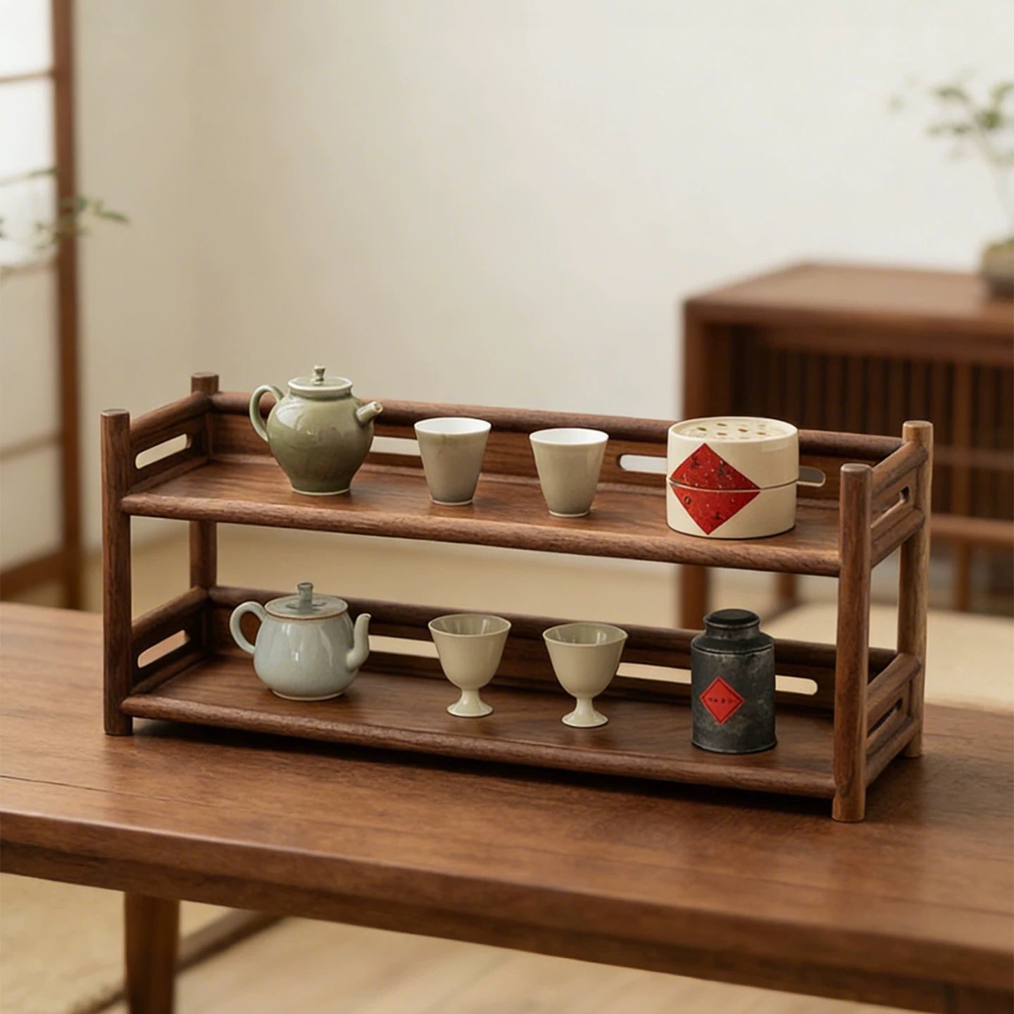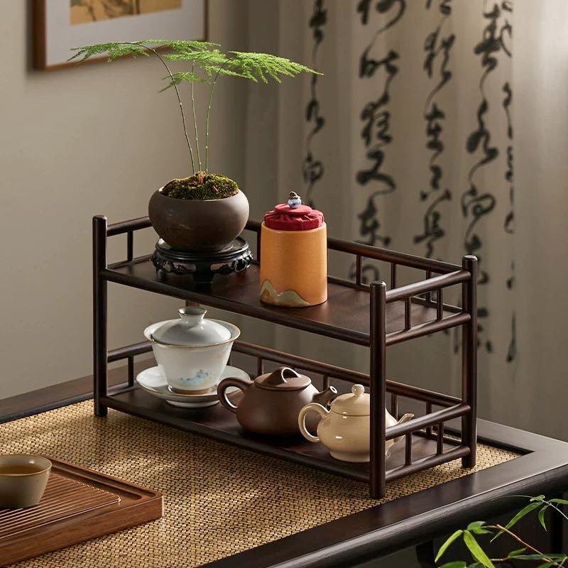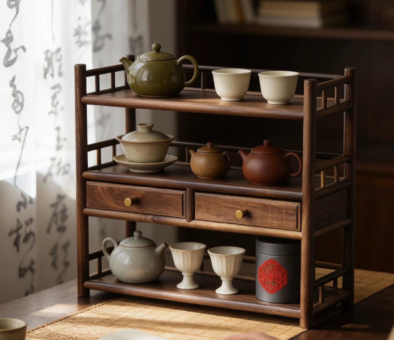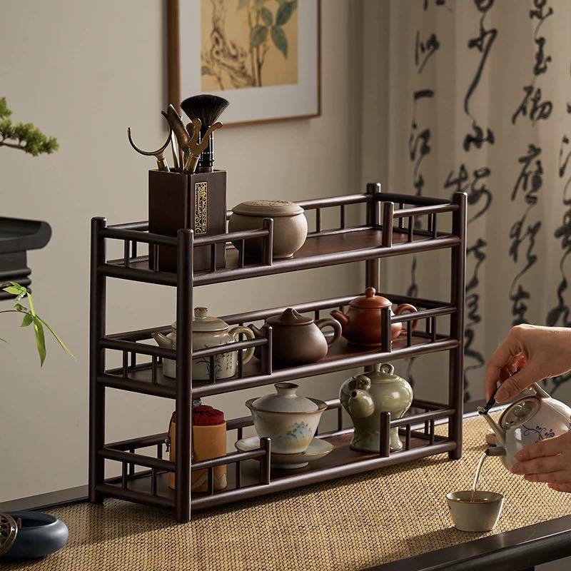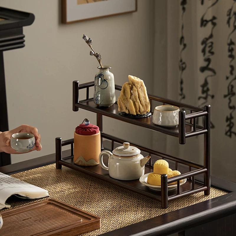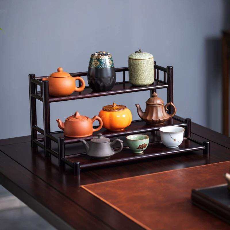 Điểm đặc biệt nằm ở sự linh hoạt: kệ có thể đặt trên bàn trà, bàn làm việc hoặc trong một góc nhỏ của căn phòng, tạo nên một “góc trà” riêng tư và tinh tế. Dù không gian lớn hay nhỏ, sản phẩm vẫn đủ khả năng trở thành điểm nhấn nhẹ nhàng nhưng đầy chiều sâu.