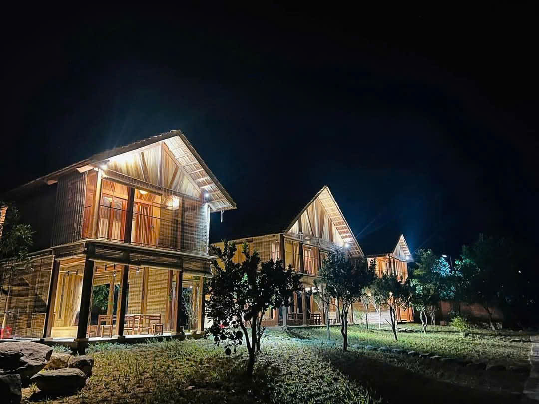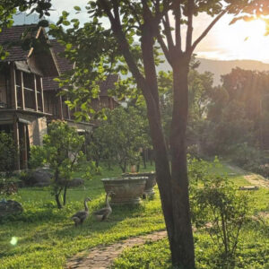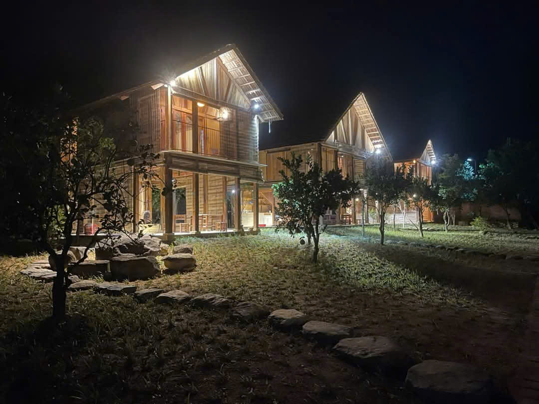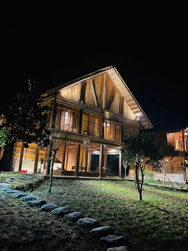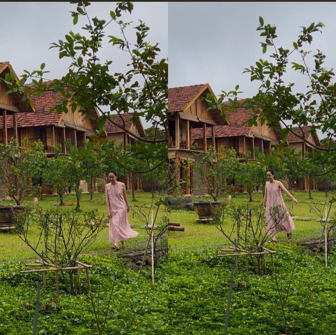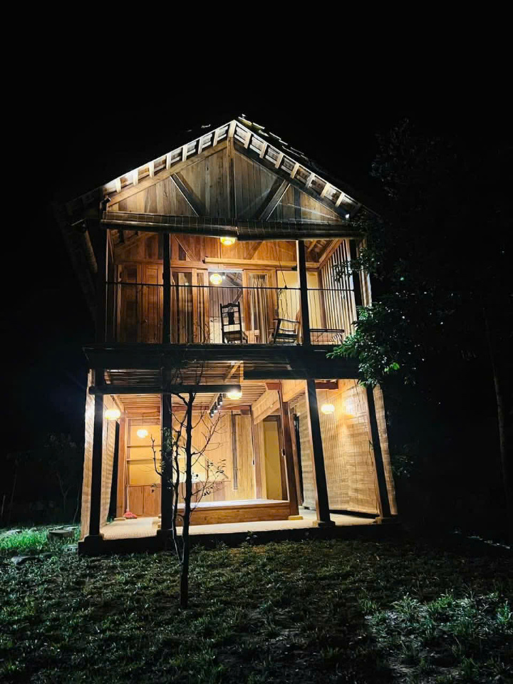 Khi ánh nắng chiều buông xuống, khung cảnh nơi đây như được phủ một lớp mật ong dịu ngọt. Căn nhà gỗ mộc mạc hiện ra bên lối nhỏ lát gạch uốn lượn, ẩn mình dưới tán cây xanh biếc