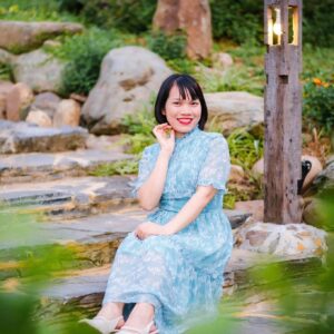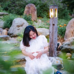 Chiếc đèn gỗ ngoài trời trong bức ảnh mang vẻ đẹp mộc mạc, dung dị nhưng rất cuốn hút. Với phần thân làm từ một khúc gỗ nguyên khối, giữ nguyên vân và sắc nâu tự nhiên, chiếc đèn toát lên nét chân thật, gần gũi với thiên nhiên. Thiết kế đơn giản với những khe hở tinh tế để ánh sáng xuyên qua, tạo thành những dải sáng dịu dàng, ấm áp giữa khung cảnh xanh mát.