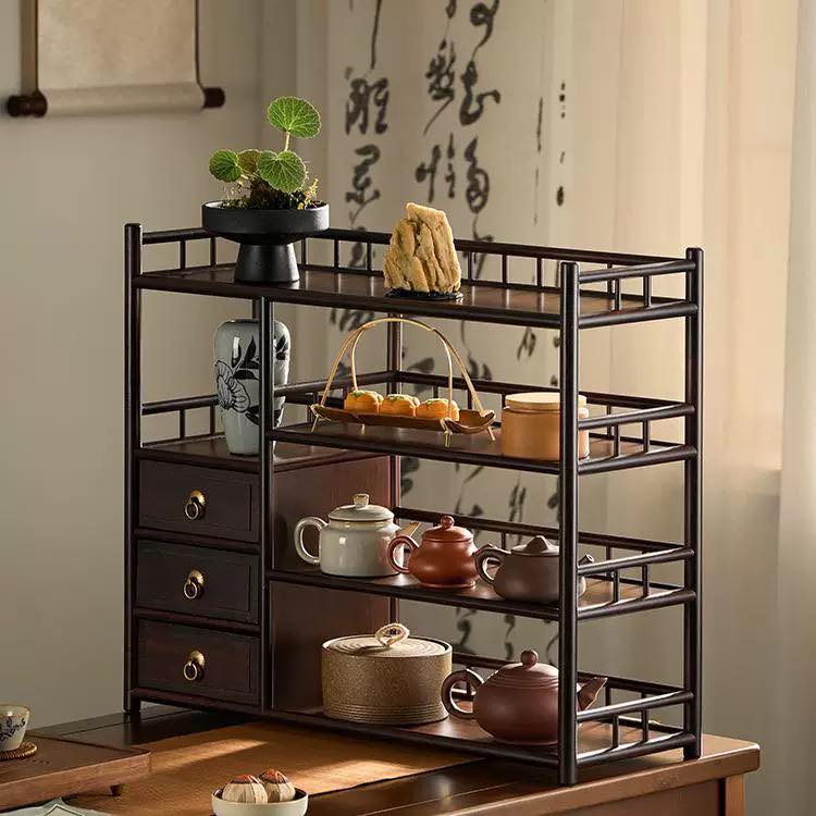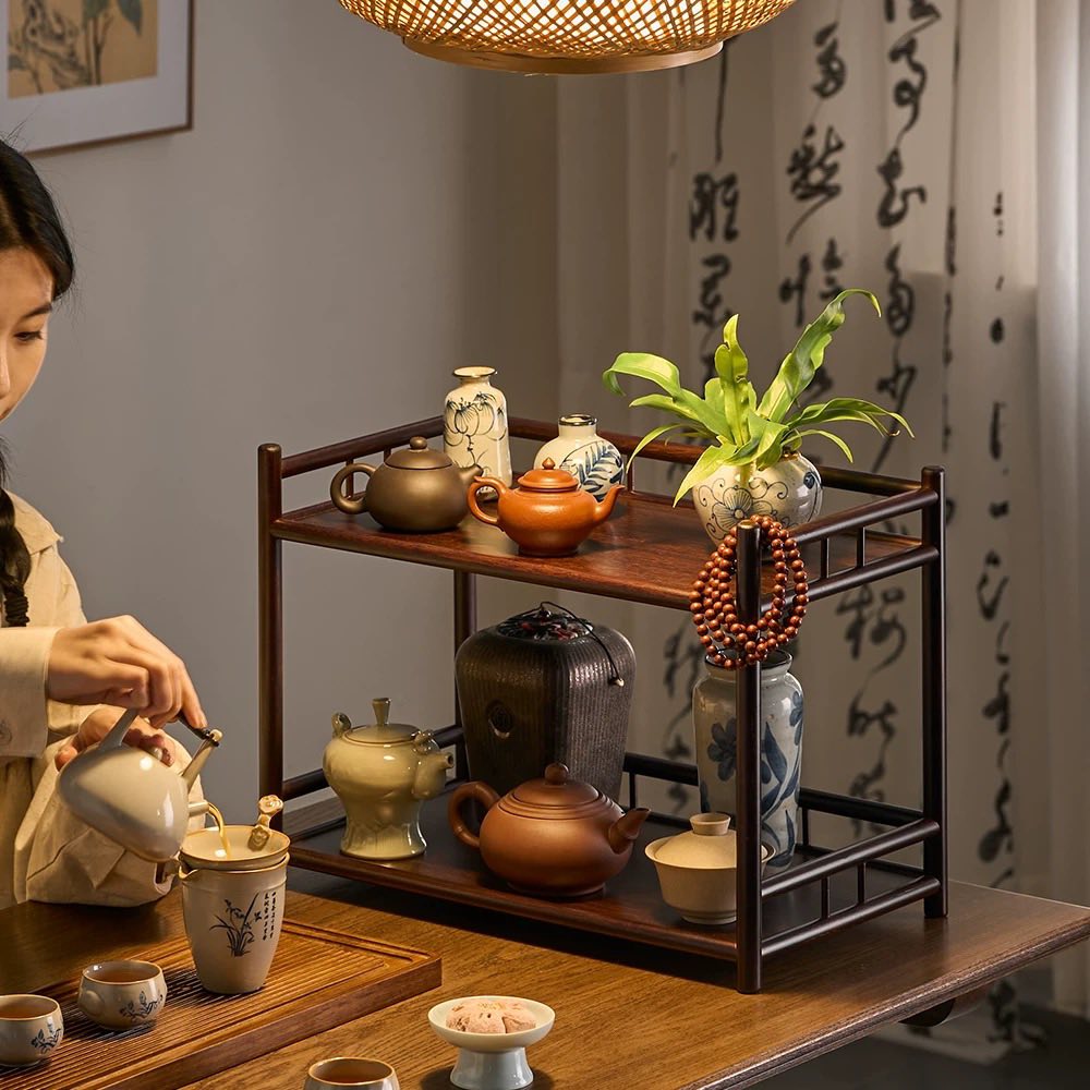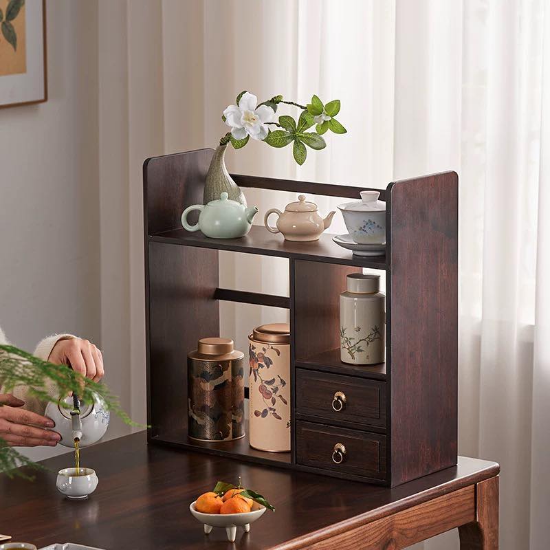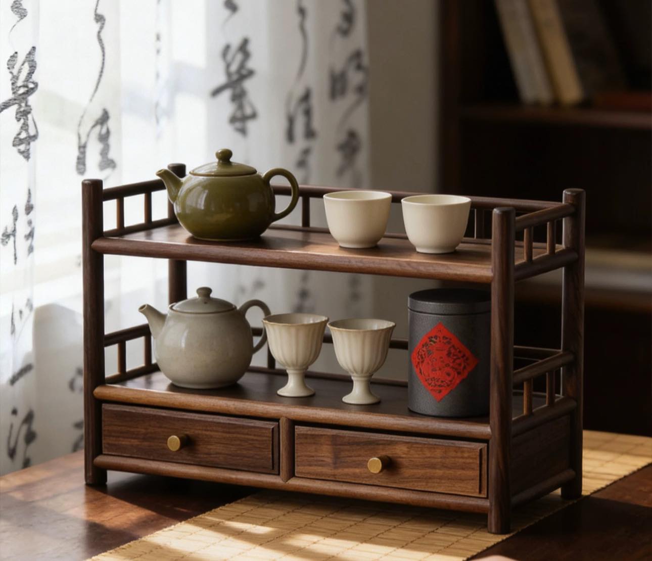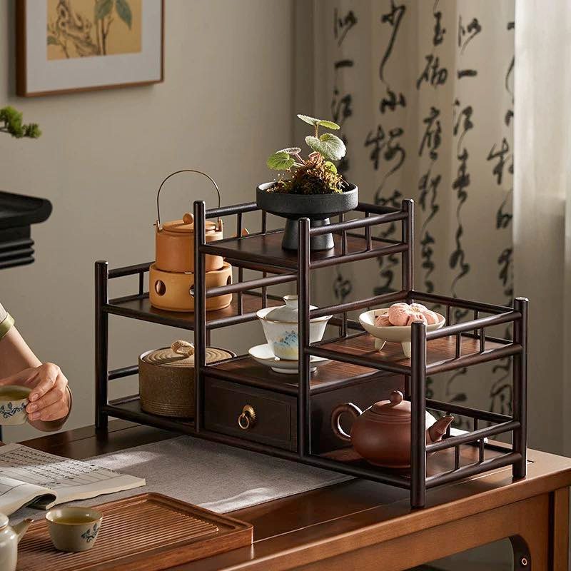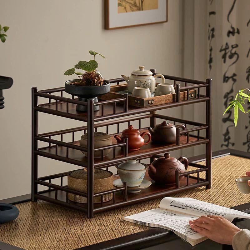 Điểm đặc biệt nằm ở sự linh hoạt: kệ có thể đặt trên bàn trà, bàn làm việc hoặc trong một góc nhỏ của căn phòng, tạo nên một “góc trà” riêng tư và tinh tế. Dù không gian lớn hay nhỏ, sản phẩm vẫn đủ khả năng trở thành điểm nhấn nhẹ nhàng nhưng đầy chiều sâu.