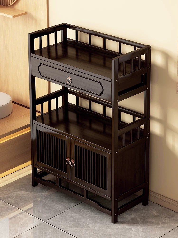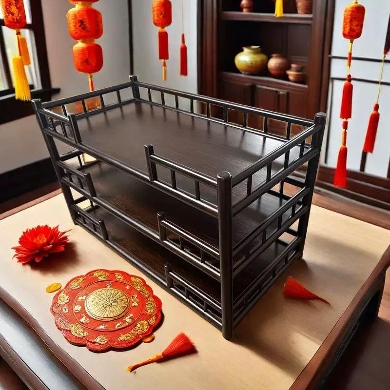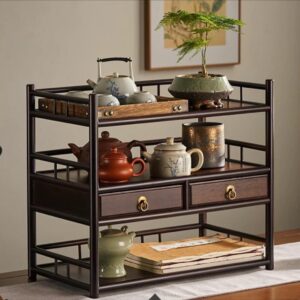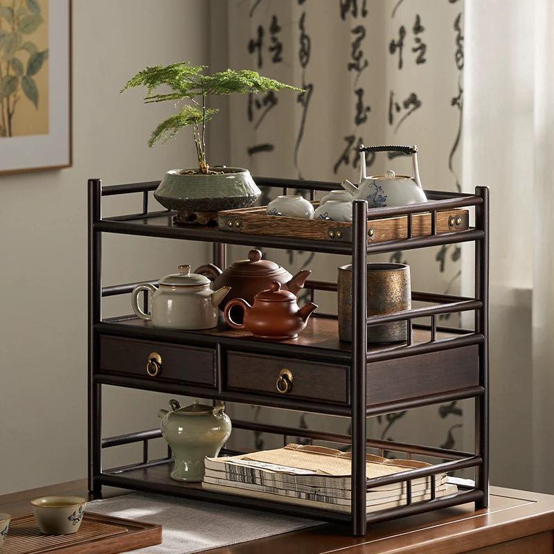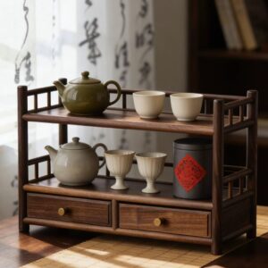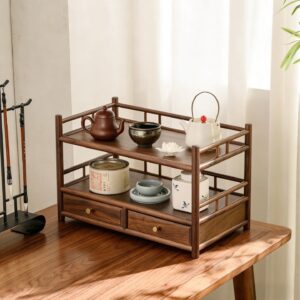 Thiết kế của kệ chú trọng tính công năng nhưng không đánh mất tính thẩm mỹ. Các tầng kệ được phân chia hợp lý để đặt ấm trà, chén, hũ trà và phụ kiện. Ngăn kéo nhỏ phía dưới giúp cất gọn những vật dụng như muỗng, khăn trà hay dụng cụ pha trà, giữ cho không gian luôn gọn gàng. Một số mẫu còn sử dụng bố cục đối xứng hoặc hình tròn – gợi liên tưởng đến sự viên mãn và hài hòa trong văn hóa phương Đông.